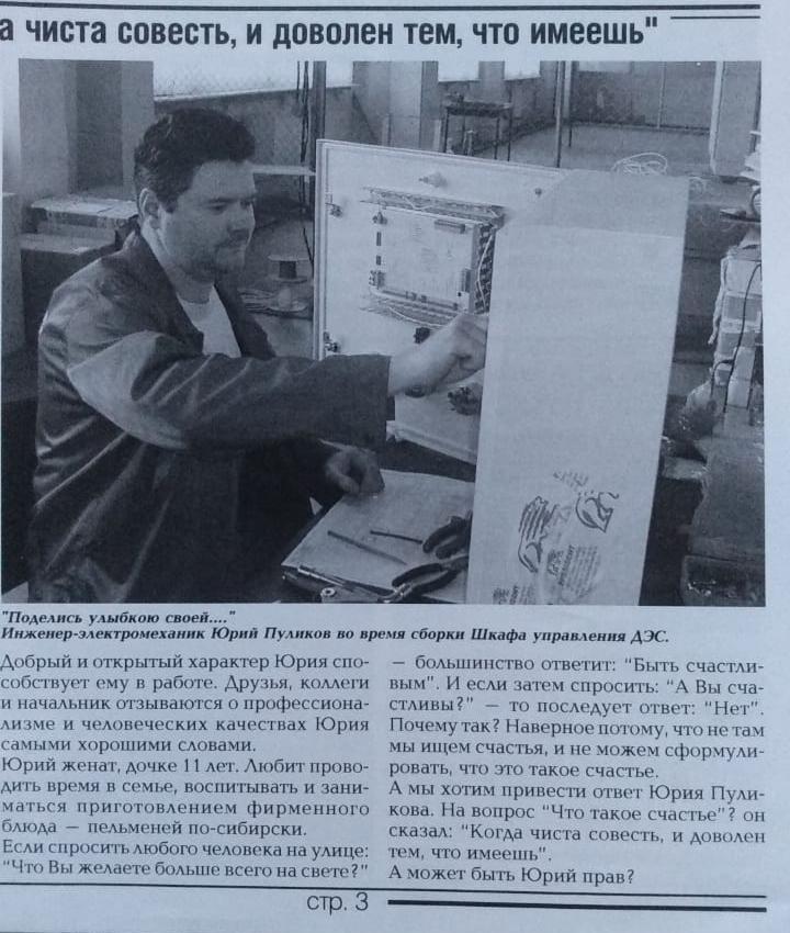 Тут старший брат предложил, перейти к нему, собирать шкафы автоматики и блоков управления. Это занятие так увлекло меня, что по сей день занимаюсь созданием шкафов автоматики, силовых электрических щитов и других изделий в области электроэнергетики. По этому направлению работал в трёх фирмах, везде с хорошим результатом, даже как-то в корпоративной газете про меня написали статью.